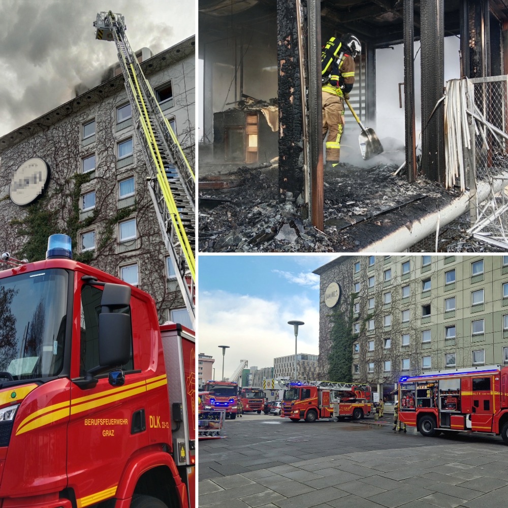 Am 26. November hat ein Dachbrand beim Hotel Daniel am Europaplatz in Graz einen größeren Feuerwehreinsatz ausgelöst. Um 9:38 Uhr schlug die automatische Brandmeldeanlage Alarm. Die Leitstelle entsandte zunächst eine Löschgruppe der Zentralfeuerwache. Nur wenige Minuten später überschlugen sich die Meldungen: Rund vierzig Notrufe erreichten die Brandmeldezentrale und bestätigten einen Vollbrand auf dem Dach.