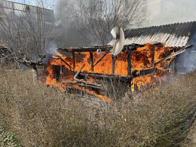 Als die Feuerwehr eintraf, stand die Hütte bereits in Vollbrand. Die Einsatzkräfte verhinderten jedoch, dass die Flammen auf angrenzende Gebäude übergriffen. Verletzt wurde niemand.