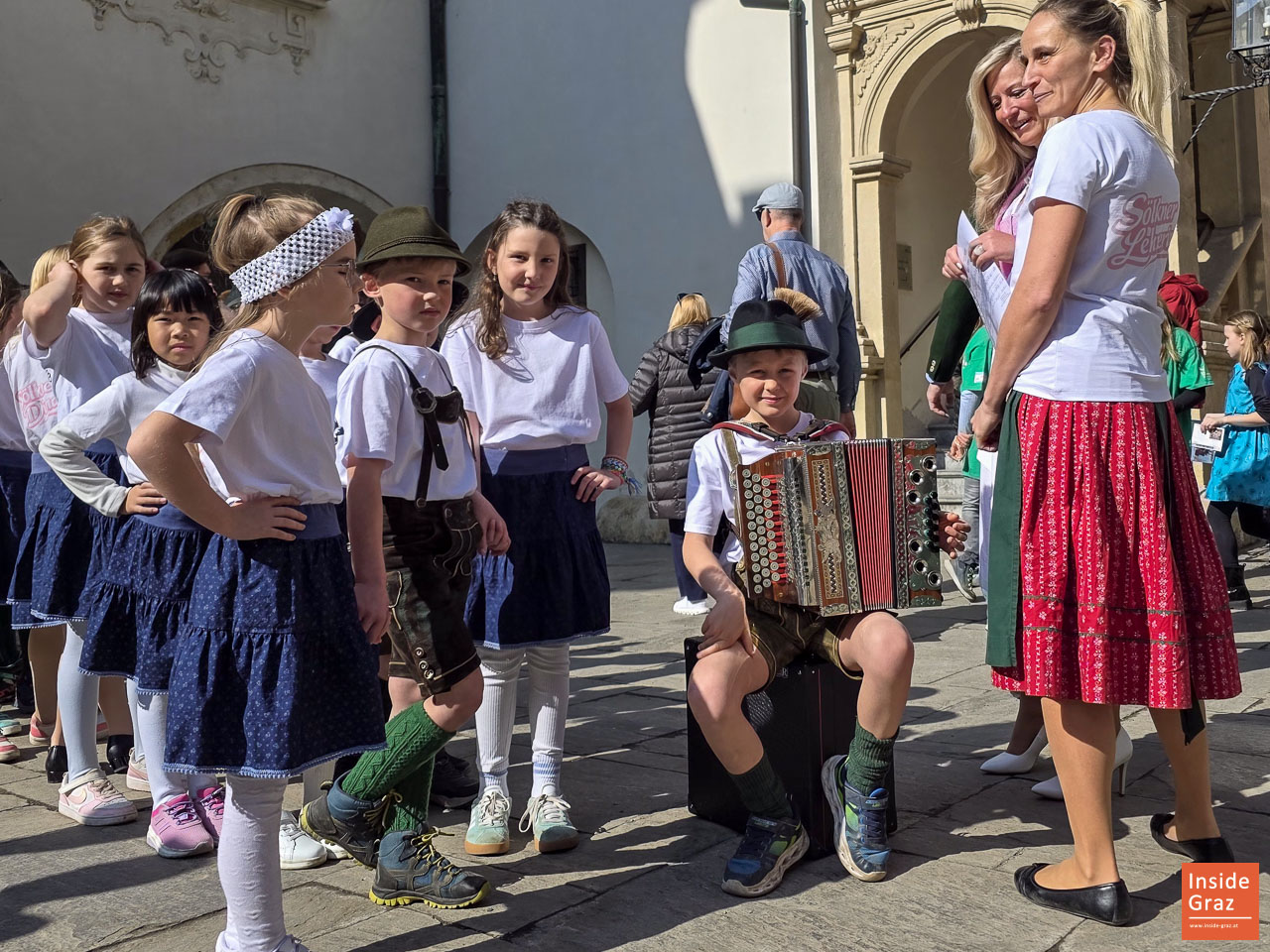 Im Grazer Landhaushof präsentierten die Kinder den Tanz schließlich als Flashmob. Für die musikalische Begleitung sorgten die Pagger Buam, die das bekannte Lied „Böll böll Kernöl“ live spielten.