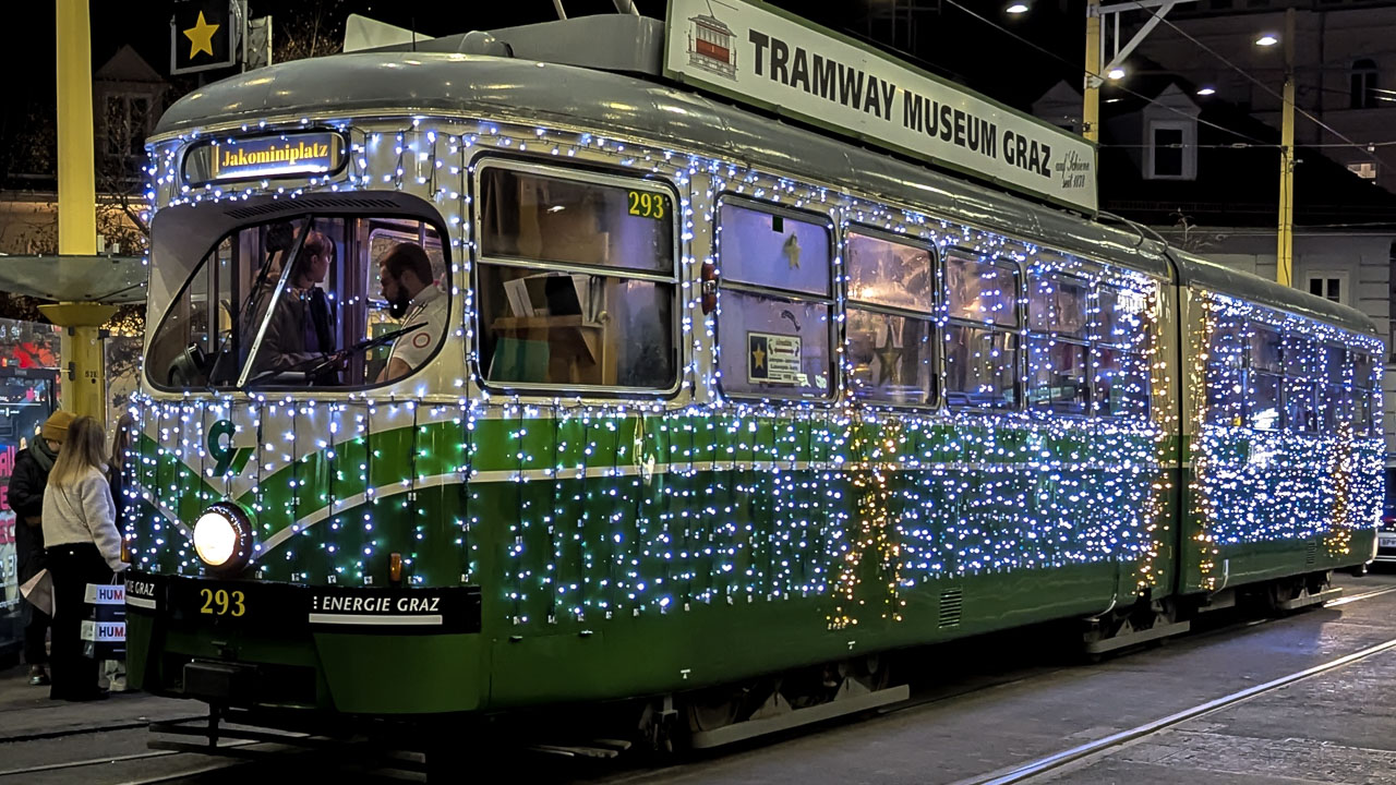 Die Winterluft liegt über der Grazer Innenstadt. Die Straßen sind belebt, Lichterketten leuchten über unseren Köpfen, und dann höre ich sie – das Quietschen der Räder. Die Adventbim naht.