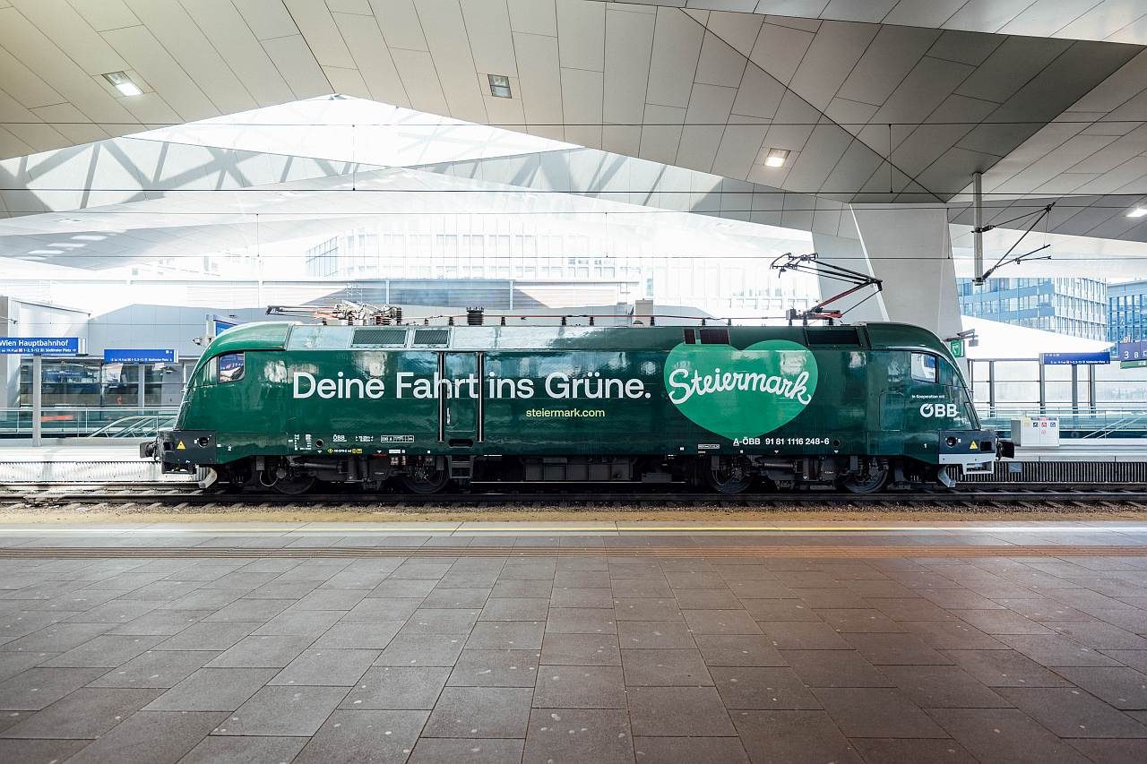 Die ÖBB und Steiermark Tourismus haben heute in Wien eine neu gestaltete Taurus-Lokomotive präsentiert. Die rund 8.700 PS starke Lok trägt den Schriftzug „Deine Fahrt ins Grüne“ sowie das bekannte Steiermark-Herz.