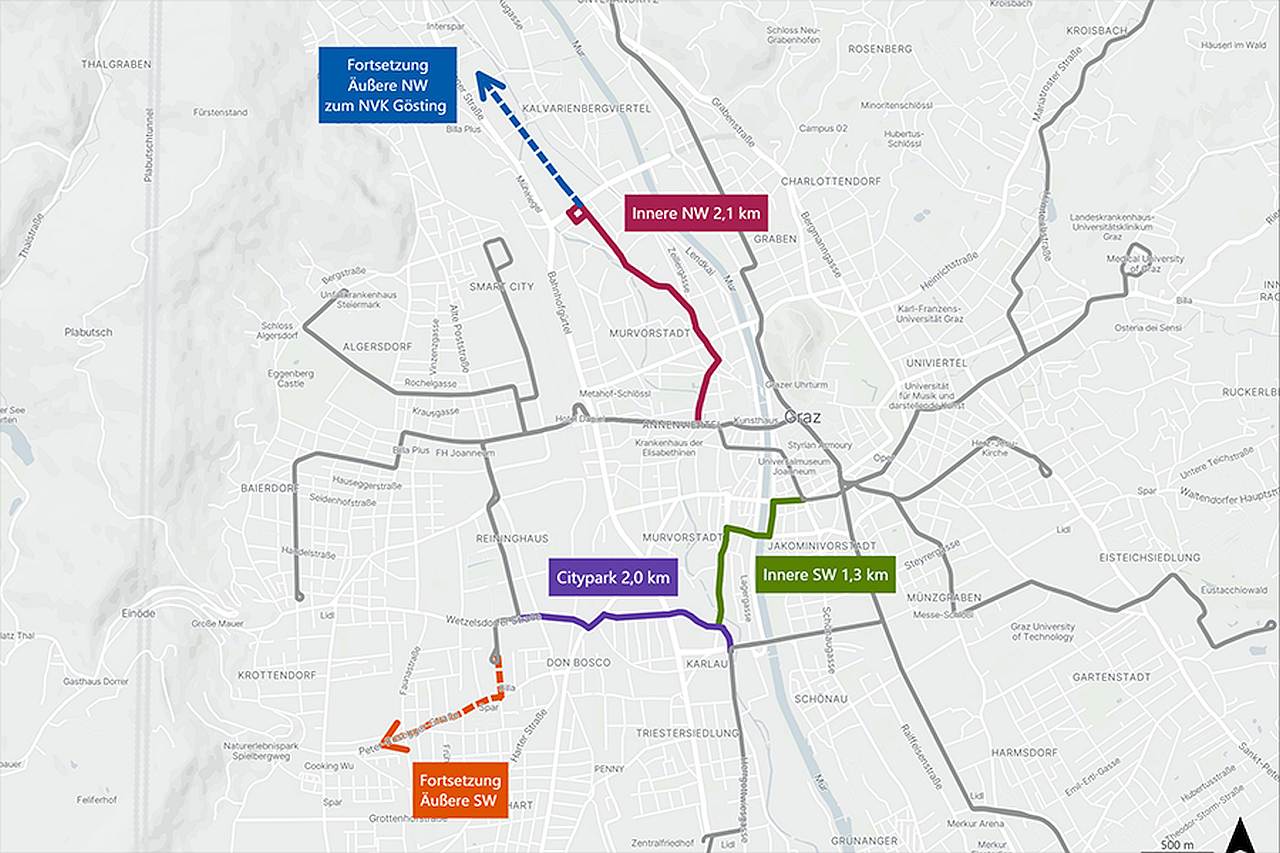 Zwischen 2026 und 2029 stehen für die Planungen insgesamt 5,37 Mio. Euro bereit. Die Kostenschätzungen liegen – auf Basis Jänner 2025 – bei rund 72 Mio. Euro für NW1 und rund 93,5 Mio. Euro für den Abschnitt Citypark–Don Bosco–Reininghaus. Der Baubeginn ist für 2030 vorgesehen, die Inbetriebnahme für 2033.