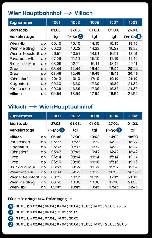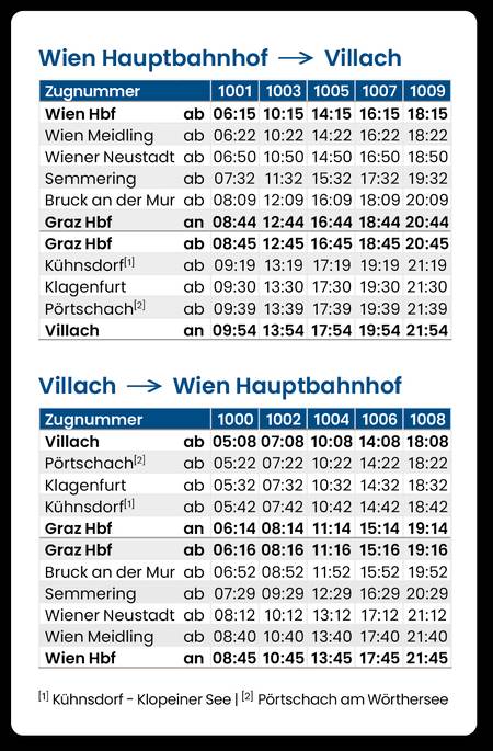 Die Premierenfahrt startet am 1. März um 06:15 Uhr am Wien Hauptbahnhof. Danach fahren die Züge täglich unter anderem über Wien Meidling, Wiener Neustadt, Bruck an der Mur, Graz, Klagenfurt und weiter bis Villach.