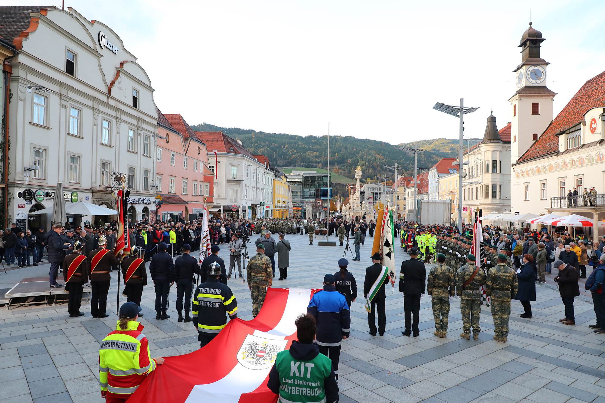 Zwei Tage vor dem Nationalfeiertag fand am Freitag, dem 24. Oktober 2025, auf dem Hauptplatz von Leoben die traditionelle Flaggenparade der steirischen Einsatzorganisationen statt. Musikalisch begleitet wurde die Feier von der Militärmusik Steiermark, der Polizeimusik Steiermark und der Feuerwehrmusik Eisbach-Rein.
